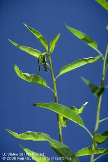Picture 9: Damage to a young almond shoot by the peach twig borer.