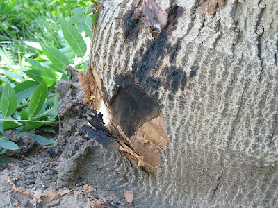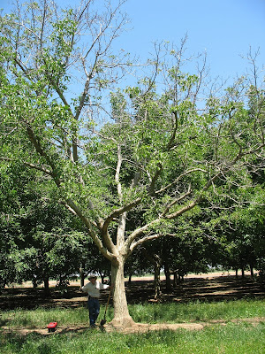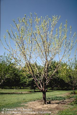 Root and crown rot of fruit and nut trees have caused major losses within orchards around the world. First reported in California in 1912, Phytophthora, which means "Plant Destroyer" in latin, causes root and crown rot throughout the San Joaquin and Sacramento valley. The problem tends to be more severe in areas of clay to clay-loam series soils, which can be attributed to the higher water holding capacity and poor drainage of these soils in comparison to sandier soils.The effect of Phytophthora spp. on root systems is often not noticed until the above ground parts of the tree show symptoms. Symptoms of Phytophthora damage are usually observed by poor tree vigor, loss of scaffold branches, and gumming or bleeding found around the tree trunk. Orchards affected by Phytophthora crown rot can suffer tree loss quickly, especially during the spring when winter-infected trees collapse during the first hot spell and during periods of high heat in which over-irrigation easily occurs. This is in contrast to tree loss that is attributed to root rot. In this case, by the time most growers recognize the symptoms, several trees are in a declining state due to a long period of infection (several years). Careful observance of the orchard can reveal problems and warrant remediation before the manifestation of severe orchard losses.Figure 1: Overall view of a walnut tree with Phytophthora. Note the collapse of the tree from top to bottom. As the disease infects the roots or crown, flow of water to the highest branches is compromised, with upper branch dieback being the first above ground symptom.In the orchard, symptoms of crown rot usually include cankers that are centered at the crown or lower part of the trunk. Removal of bark in affected areas will reveal brown or black sap-wood that may be gum soaked with stone fruit trees or slimy with pome and walnut trees. Cankers are clearly delineated, with very little dis-colorization in the wood that is found outside the necrotic areas. Removal of soil from around the trunk will reveal the canker’s infectious path, moving up the tree from the soil. In some cases, cankers may extend some distance up the trunk. Crown rot kills the tree through phloem damage which prevents the conduction of nutrients up the tree.
